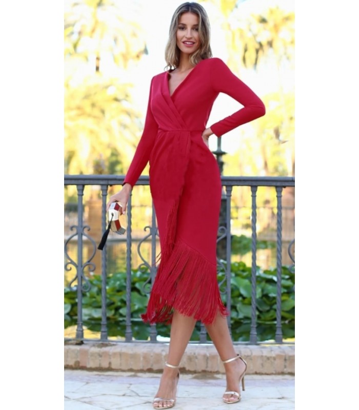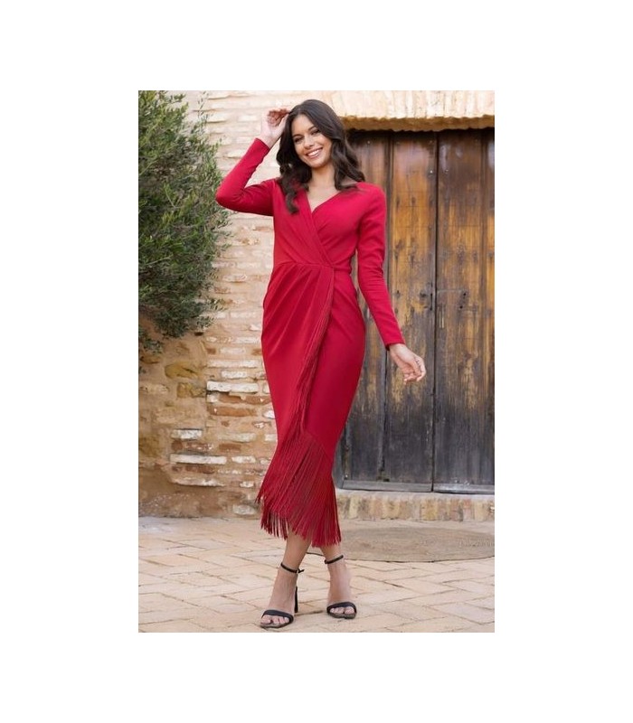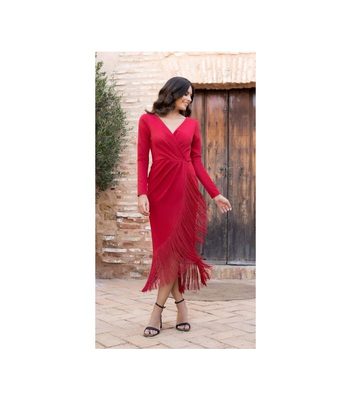 Vestido cruzado con flecos de seda. La falda tiene corte tulipán y la manga es larga. ¡Super favorecedor!. Tiene cremallera trasera y no lleva forro.