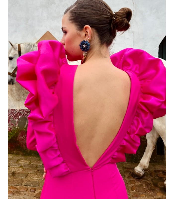 Vestido en tejido biolástico con manga a la sisa y detalle de volante en tafetán.